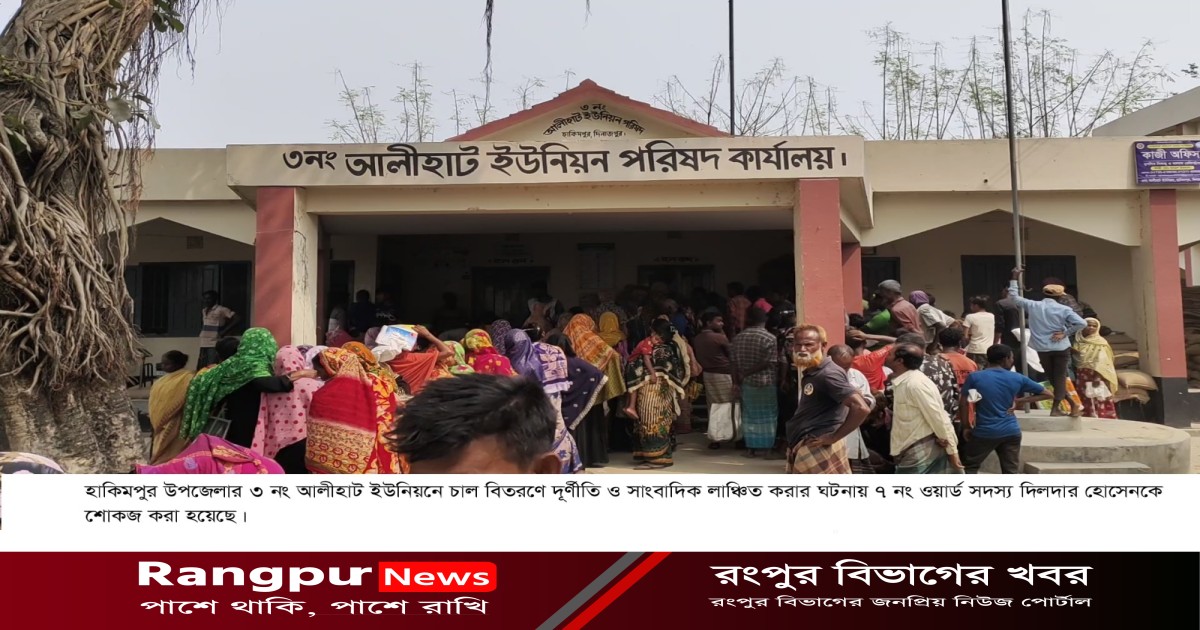 ভিজিএফ চাল বিতরণে অনিয়মের সংবাদ সংগ্রহে গেলে সাংবাদিক লাঞ্চিতের ঘটনায় ৩ নং আলীহাট ইউনিয়নের ইউপি সদস্য দিলদার হোসেনকে শোকজ করা হয়েছে। শনিবার হাকিমপুর ইউএনও অশোক বিক্রম চাকমা বিষটি নিশ্চিত করেছেন। তিনি জানান, গত বুধবার ৩ টি ইউনিয়ন ও একটি পৌর সভায় ভিজিএফ চাল বিতরণ চলছিল। ভিজিএফ চাল ওজনে কম দেওয়ায় দৈনিক সমকাল পত্রিকার সাংবাদিক প্রশ্ন করলে তাঁকে লাঞ্জিত করা হয়। পরদিন বৃহষ্পতিবার চাল বিতরণে দূর্ণীতি ও সাংবাদিক লাঞ্চিত করার অপরাধে তাকে কারণ দর্শনোর নোটিশ দেওয়া হয়। আগামী রোববারের মধ্যে নোটিশের জবাব দিতে বলা হয়েছে। উপযুক্ত জবাব না পেলে তার বিরুদ্ধে পরবর্তী ব্যাবস্থা নেওয়া হবে।