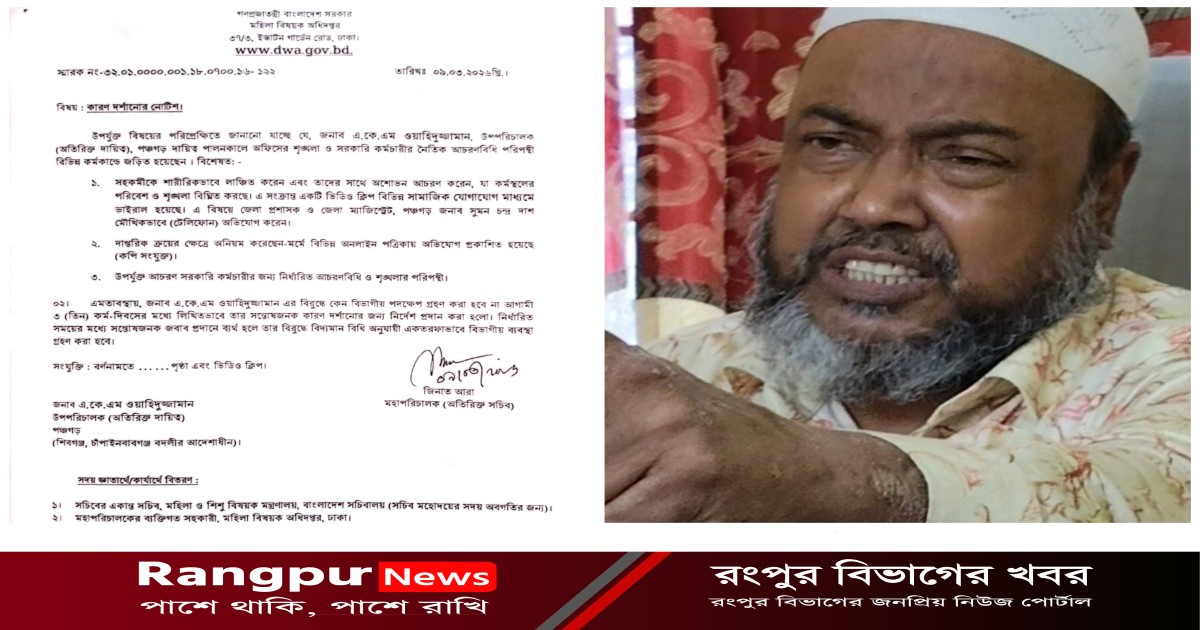 সহকর্মীকে শারীরিকভাবে লাঞ্ছিত করার অভিযোগ ও সেই ঘটনার ভিডিও সামাজিক যোগাযোগমাধ্যমে ভাইরাল হওয়ার পর পঞ্চগড় জেলা মহিলা বিষয়ক কার্যালয়ের অতিরিক্ত দায়িত্বে থাকা উপপরিচালক এ.কে.এম ওয়াহিদুজ্জামানকে কারণ দর্শানোর নোটিশ দিয়েছে মহিলা বিষয়ক অধিদপ্তর। অভিযোগের বিষয়ে তিন কর্মদিবসের মধ্যে সন্তোষজনক ব্যাখ্যা দিতে তাকে নির্দেশ দেওয়া হয়েছে।