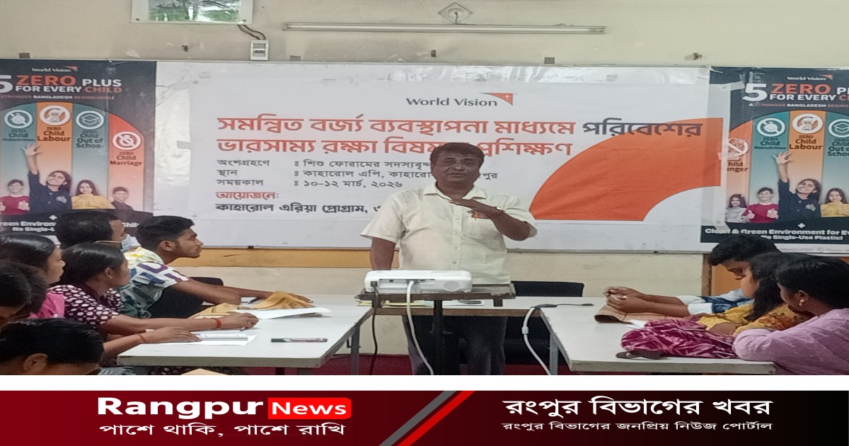 দিনাজপুরের কাহারোলে শিশু ফোরামের সদস্য দের তিন দিনের প্রশিক্ষণ অনুষ্ঠিত হয়েছে। বাংলাদেশ ওয়ার্ল্ড ভিশন কাহারোল এরিয়া প্রোগ্রাম এর আয়োজনে ১০ মার্চ হতে ১২ মার্চ ২০২৬ ইং এই তিন দিন ব্যাপী শিশু ফোরামের ৩০ জন সদস্য দের মধ্যে সমন্বিত বর্জ্য ব্যবস্থাপনা মাধ্যমে পরিবেশ ভারসাম্য রক্ষা বিষয়ক প্রশিক্ষণ প্রদান করা হয়েছে। প্রশিক্ষণ প্রদান করেন, বন বিভাগ অফিসার নিরন্জন রায়, কৃষি উপ সহকারী কর্মকর্তা মোঃ জাকির হোসেন। এ সময় উপস্থিত ছিলেন, কাহারোল ওয়ার্ল্ড ভিশন প্রোগ্রাম ম্যানেজার লাভলী লাকী বিশ্বাস, প্রোগ্রাম অফিসার পলাশ ক্রুশ, প্রোগ্রাম অফিসার মিঃ আলবিনুশ সরেন প্রমূখ।