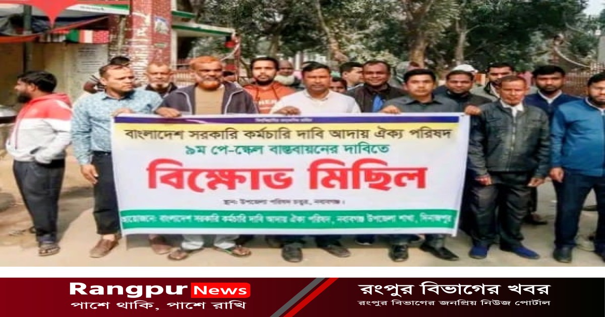 দিনাজপুরের নবাবগঞ্জে বাংলাদেশ সরকারি কর্মচারী দাবি আদায় ঐক্য পরিষদের উদ্যোগে ৯ম পে-স্কেল দ্রুত বাস্তবায়নের দাবিতে বিক্ষোভ মিছিল ও সংক্ষিপ্ত সমাবেশ অনুষ্ঠিত হয়েছে। সোমবার (০২ ফেব্রুয়ারি) বেলা ১২টার দিকে উপজেলা পরিষদ গেট থেকে এ বিক্ষোভ মিছিল শুরু হয়।