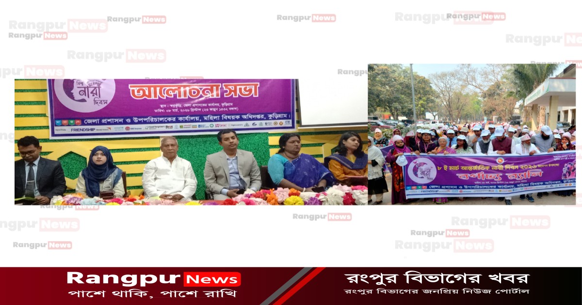 "আজকের পদক্ষেপ, আগামী ন্যায়বিচার সুরক্ষিত হোক নারী ও কন্যার অধিকার" এই প্রতিপাদ্যে কুড়িগ্রাম সদরে ও নাগেশ্বরী উপজেলায় আন্তর্জাতিক নারী দিবস ২০২৬ উদযাপন উপলক্ষে র্যালি ও আলোচনা সভা অনুষ্ঠিত হয়েছে।