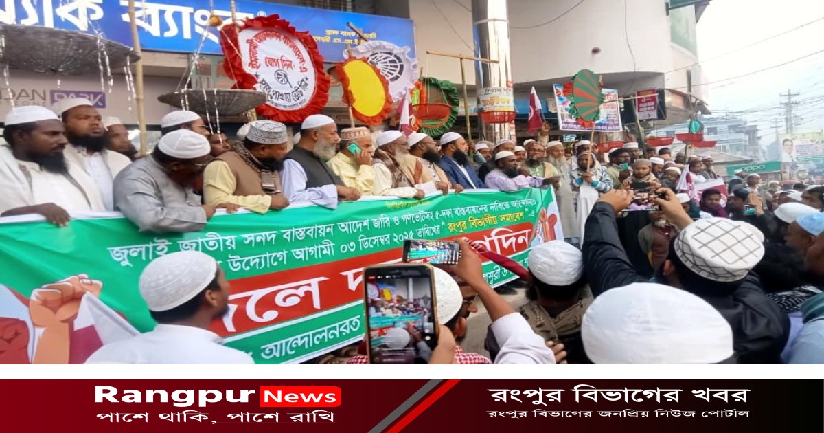কুড়িগ্রামের নাগেশ্বরীতে জুলাই জাতীয় সনদ বাস্তবায়ন আদেশ জারি ও গণভোটসহ পাঁচ দফা দাবিতে আন্দোলনরত ইসলামি সমমনা ৮ দলের উদ্যোগে বিক্ষোভ মিছিল অনুষ্ঠিত হয়েছে।
