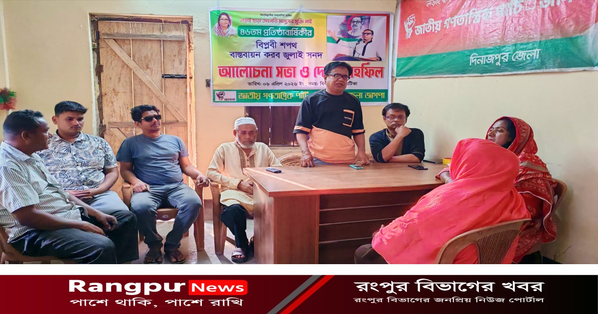 "লড়াই ছাড়া মেহনতি মানুষের মুক্তি নেই"—এই স্লোগানকে সামনে রেখে দিনাজপুরে জাতীয় গণতান্ত্রিক পার্টি (জাগপা)র ৪৬তম প্রতিষ্ঠাবার্ষিকী উপলক্ষে আলোচনা সভা ও দোয়া মাহফিল অনুষ্ঠিত হয়েছে।