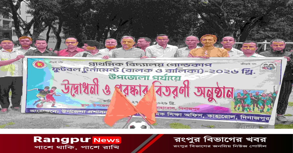 উৎসবমুখর পরিবেশে অনুষ্ঠিত হলো প্রাথমিক বিদ্যালয় গোল্ডকাপ ফুটবল টুর্নামেন্টের উদ্বোধনী অনুষ্ঠান।উপজেলা প্রশাসন ও উপজেলা প্রাথমিক শিক্ষা অফিসের আয়োজনে ২৬ এপ্রিল রবিবার ২০২৬ ইং তারিখে সকাল ১০ ঘটিকায় উপজেলা পরিষদ মাঠ প্রাঙ্গণে এই টুর্নামেন্টের উদ্বোধনী অনুষ্ঠান অনুষ্ঠিত হয়েছে। খেলা উদ্বোধন করেন, দিনাজপুর -১ আসনের জাতীয় সংসদ সদস্য আলহাজ্ব মোঃ মনজুরুল ইসলাম এর প্রতিনিধি হিসেবে কাহারোল উপজেলা বিএনপির সভাপতি মোঃ গোলাম মোস্তফা বাদশা। এ সময় উপস্থিত ছিলেন, উপজেলা প্রাথমিক শিক্ষা অফিসার এম এ জিন্নাত আলী, সহকারী শিক্ষা অফিসার মোঃ সিরাজ উদ্দিন, রামচন্দ্র পুর মডেল সরকারি প্রাথমিক বিদ্যালয়ের প্রধান শিক্ষক মোঃ আশরাফুল ইসলাম, কামোর সরকারি প্রাথমিক বিদ্যালয়ের প্রধান শিক্ষক মোঃ মামুনুর রশিদ সহ উপজেলার বিভিন্ন প্রাথমিক বিদ্যালয়ের শিক্ষক বৃন্দ উপস্থিত ছিলেন।