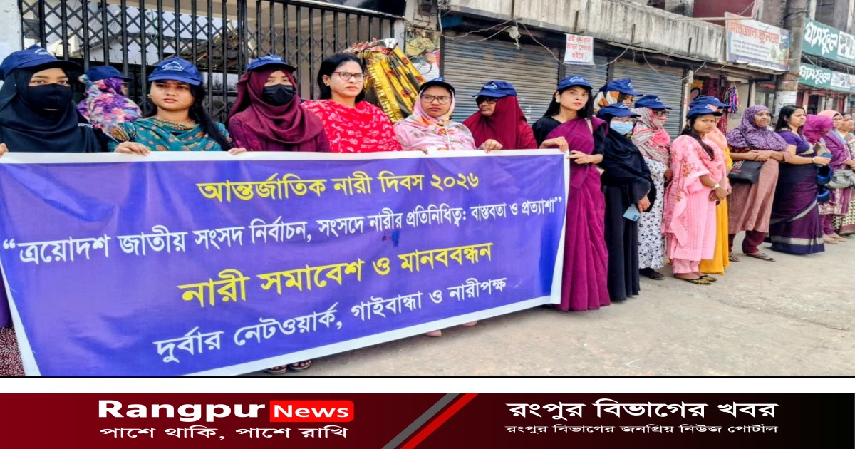 "ত্রয়োদশ জাতীয় সংসদ নির্বাচন, সংসদে নারীর প্রতিনিধিত্ব বাস্তবতা ও প্রত্যাশা" এই প্রতিপাদ্যকে সামনে রেখে আন্তর্জাতিক নারী দিবস উপলক্ষে গাইবান্ধায় নারী সমাবেশ ও মানববন্ধন অনুষ্ঠিত হয়েছে।