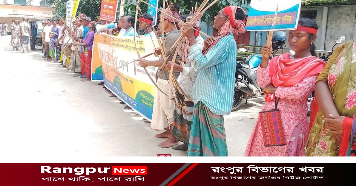 বুধবার সকালে কাটাবাড়ী ইউনিয়নের সাঁওতাল পল্লী থেকে নারী-পুরুষেরা ঐতিহ্যবাহী তীর-ধনুক নিয়ে মিছিলসহ দীর্ঘ পথ অতিক্রম করে উপজেলা সদরে আসেন। পরে তারা উপজেলা নির্বাহী অফিসার (ইউএনও) সৈয়দা ইয়াসমিন সুলতানার কাছে স্মারকলিপি প্রদান করেন।